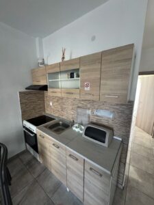 U prizemlju se nalazi dvokrevetni studio (1/2 std) koji ima francuski ležaj u sobi i kuhinjski deo u kome se nalazi mini šporet sa rernom i dve ringle, mali frižider. Studio ima terasu koja se nalazi u dvorištu kuće. Kupatilo ima tuš kadu.